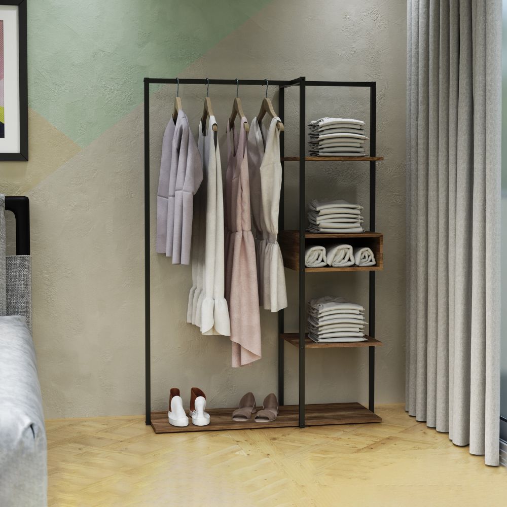Cores em Linha: Preto com prateleiras amadeiradas